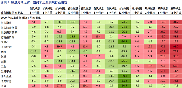 考察2000年以来美联储加息周期结束至首次降息期间港股各行业表现,我们会发现:信息科技在整个减息周期内都要较强劲的表现,工业、能源、材料这些高股息行业有较为居前的收益,另外两大类消费品也有不错的表现。