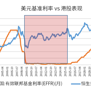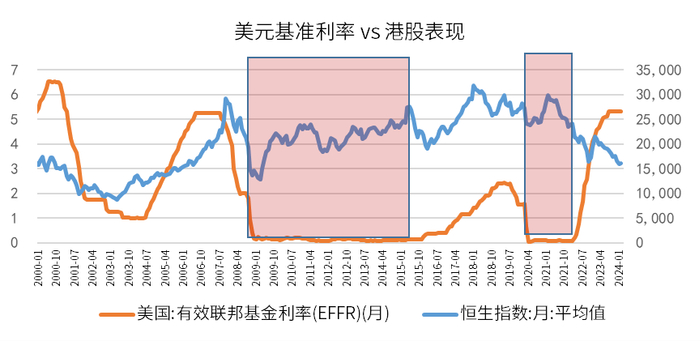 港股作为离岸美元市场,背靠内地、联通全球,募集资金一直领先全球,估值对于美元的流动性变化也更为敏感。统计近二十年以来海外货币政策与港股表现的联系可以发现,宽松货币政策下,港股一般不会有太大向下风险(下图红色框)。市场资金增多、利率降低,投资者信心增强,作为全球金融中心之一,港股可能吸引更多的资金流入,从而推动股价上涨。
