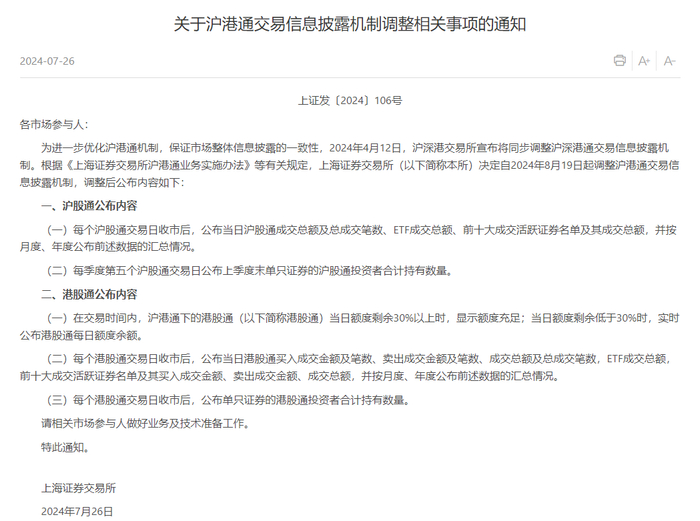 根据沪深交易所的公告,调整后,每天收盘后公布的内容,从北向资金的详细走向变成了成交总额和活跃证券名单,而且这些数据还得按月度、年度汇总公布。