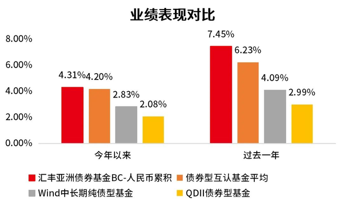 今年以来、过去1年,汇丰亚洲债基金(BC-人民币累积)收益率均跑赢同类债券型香港互认基金平均,也好于Wind QDII债券型基金指数和Wind中长期纯债型基金指数。