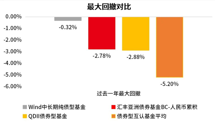 过去1年,汇丰亚洲债基金(BC-人民币累积)最大回撤优于同类债券型香港互认基金平均和Wind QDII债券型基金指数。