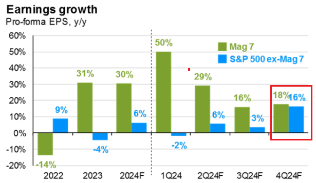 “七巨头”的业绩增长可能已经在一季度见顶,到了今年四季度,标普“其他493家”公司每股收益增长有望逐渐追平“七巨头”。