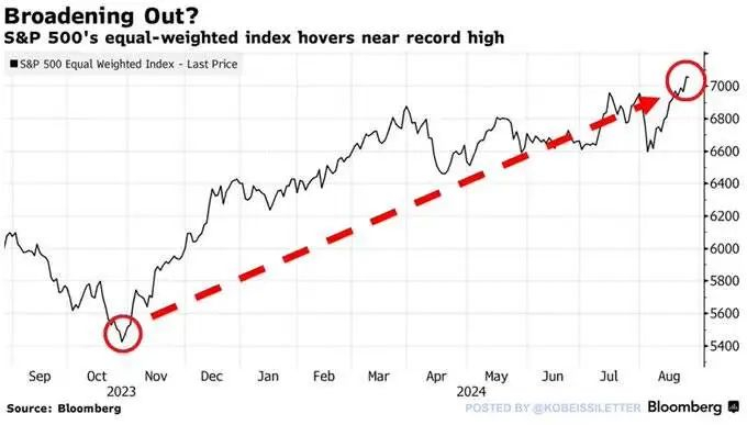 目前,除了道指,标普500等权重也已经创下历史新高。在过去的三周里,随着市场从8月初的调整中复苏,等权重指数上涨了约7%。