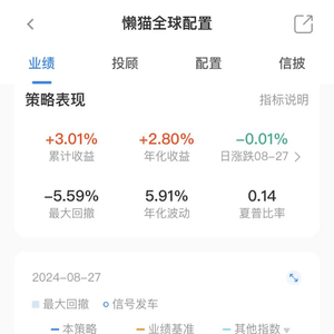 也可以看看懒猫另外一个组合——懒猫全球稳健,这是一个偏固收+的组合,波动相对于懒猫全球配置组合会小一些。