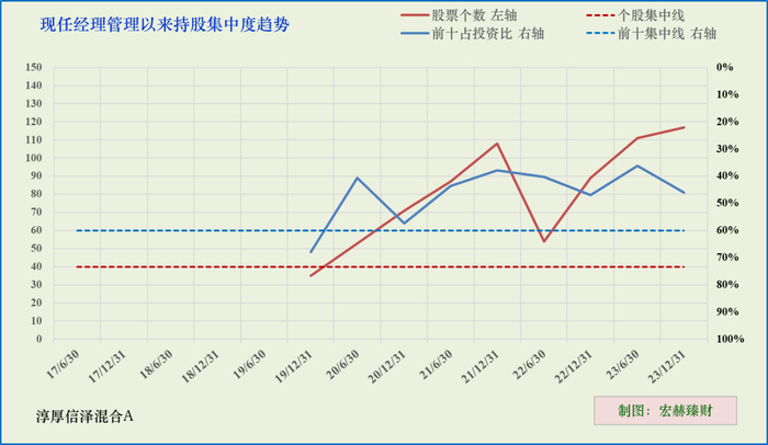 右轴:蓝色折线表示前十仓的持股占投资比例,蓝色虚线表示前十仓的集中度线,虚线往下表示前十仓愈加集中,虚线以上表示前十仓趋于分散。