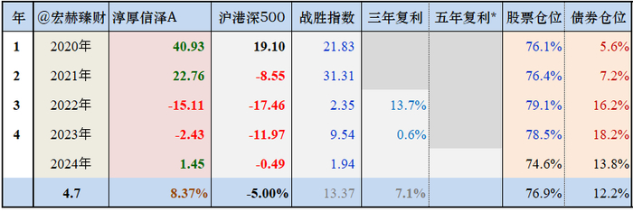 有整年度业绩以来4.7年时间,该基金平均股票仓位为76.9%,债券仓位12.2%;实现年均复利收益率为 8.37%,同期指数为 -5.00%。