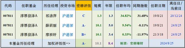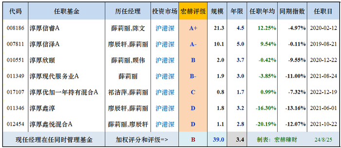目前薛莉丽经理为主管理着7只沪港深基金,平均任职年限3.4年,合计管理规模39亿,宏赫业绩加权评级为【B】。