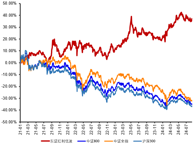数据来源:Wind,统计区间2021.01.04-2024.08.16。各指数代码:东证红利低波(931446)、中证800(000906)、中证全指(000985)、沪深300(000300)。指数历史数据仅供展示,不代表未来表现及基金业绩。