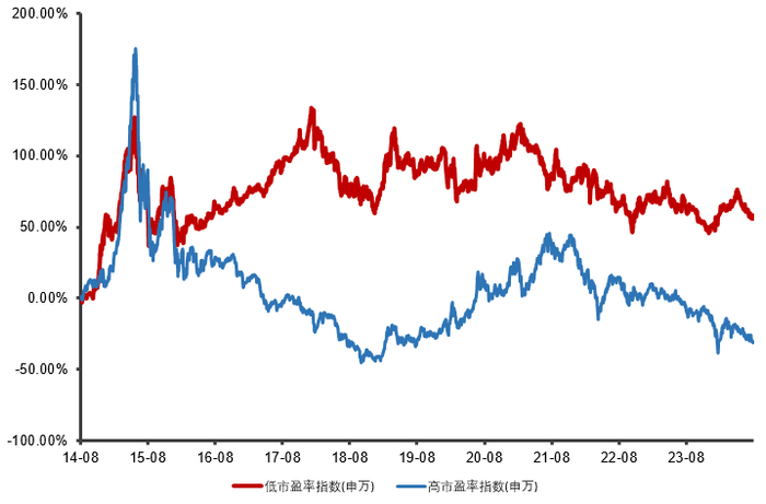 数据来源:Wind,统计区间2014.08.17-2024.08.16。低市盈率指数(申万)(代码801823)、高市盈率指数(申万)(代码:801821)。