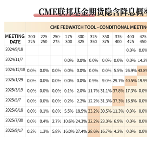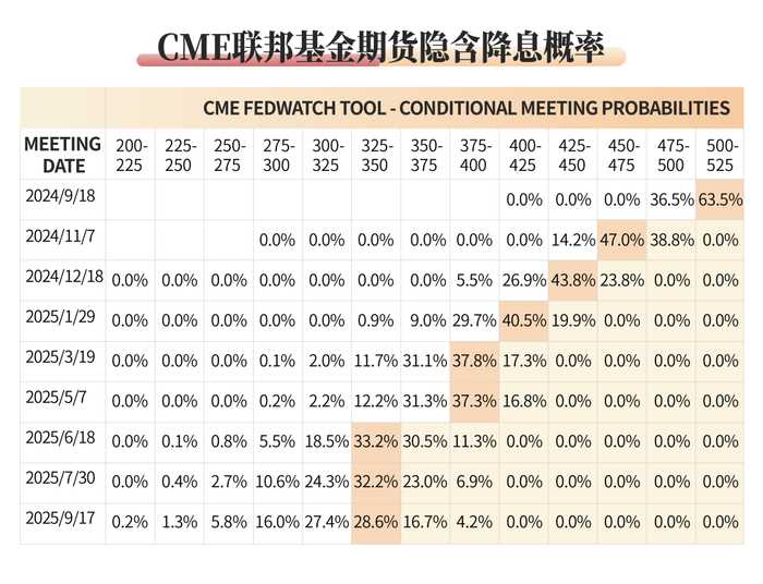 数据来源:CMEGroup.com,截至2024.8.20。当前美国联邦基金目标利率为525-550,因此降到500-525为降息25BP,降到475-500为降息50BP。市场过往表现不代表未来,市场有风险,投资需谨慎。