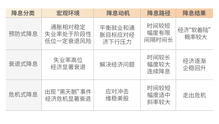 而细数美联储降息始末,细致分类下,美联储降息根据宏观环境、降息动机、降息路径及结果,可以分为三类——预防式降息、衰退式降息和危机性降息各自的特征如下: