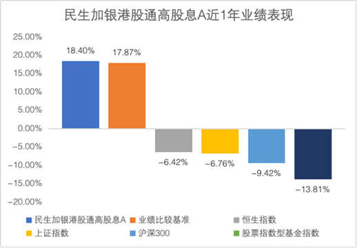 在股市震荡的情况下,民生加银港股通高股息A,近一年净值增长率为18.40%(同期业绩比较基准收益率17.87%),业绩表现超越同期主流宽基指数及股票型基金指数。