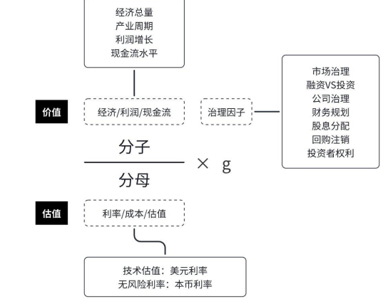这个公式,其实就是把复杂的现金流折现模型,转化为一个以分子、分母和治理引子为变量的分析框架。