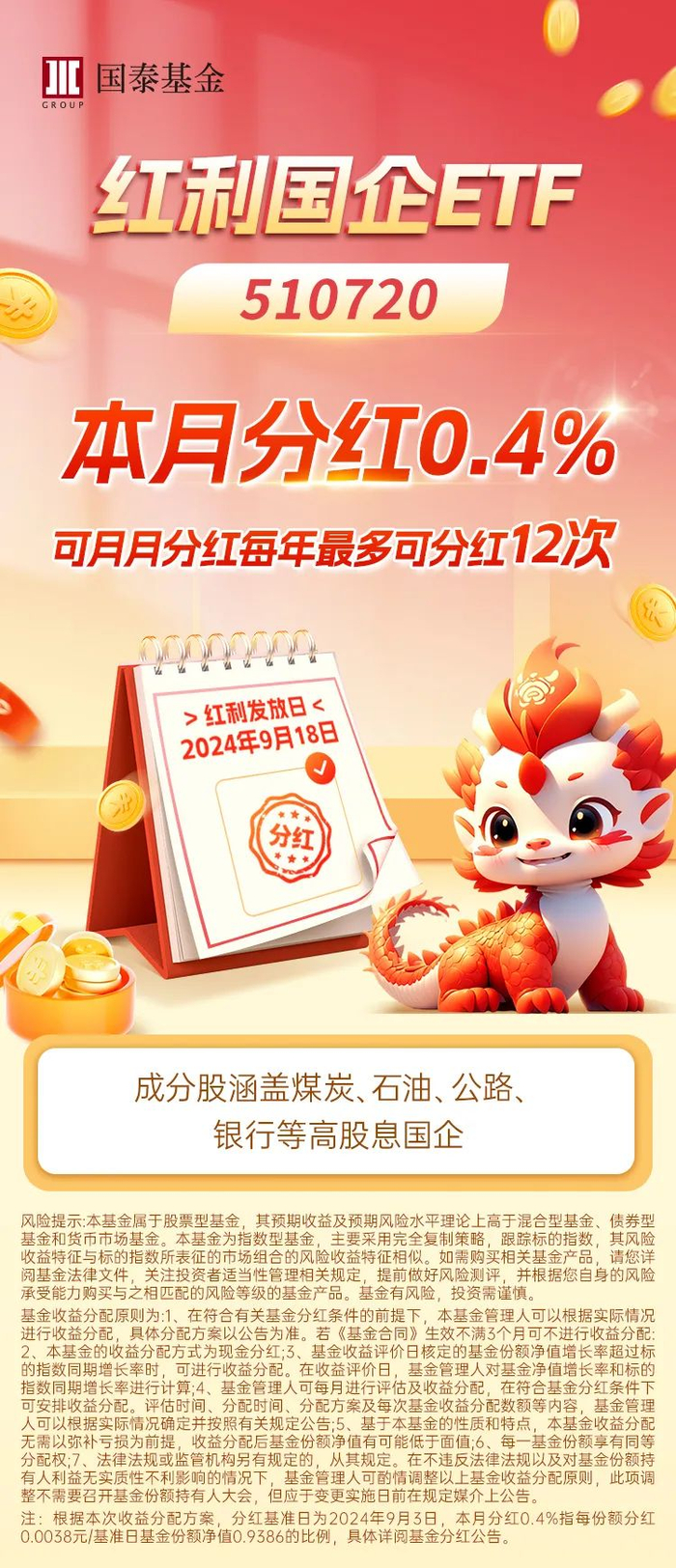 近日,红利国企ETF(510720)发布第五次分红公告,本次分红方案为0.038元/10份基金份额,分红比例0.4%。权益登记日为9月10号,现金红利发放日为9月18日。这也是红利国企ETF上市后连续第五个月分红。