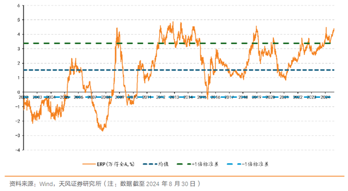 截至2024年8月30日,万得全A的ERP在4.34%水平,高于历史均值一倍标准差(3.38%)。历史分位数方面,自2002年以来,当前的ERP分位数为97.20%,也处于历史较高位置。
