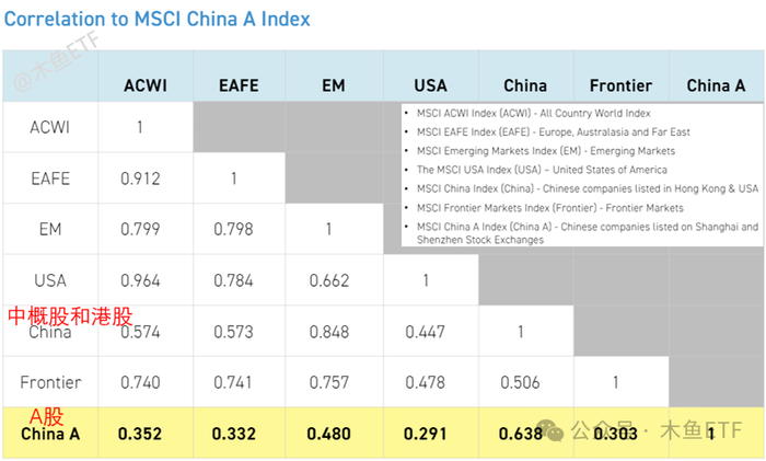 第二条,就是A股与全球其他市场的相关性很低,这是丰富资产多元化配置的拼板。相关性,就是指一起涨或一起跌的联动程度。A股反正就是不跟涨,欧美大跌时好像也不太跌,因此相关性当然低。但是在成熟投资者眼中,这是一个配置的优势,有助于降低整体持仓的波动率。