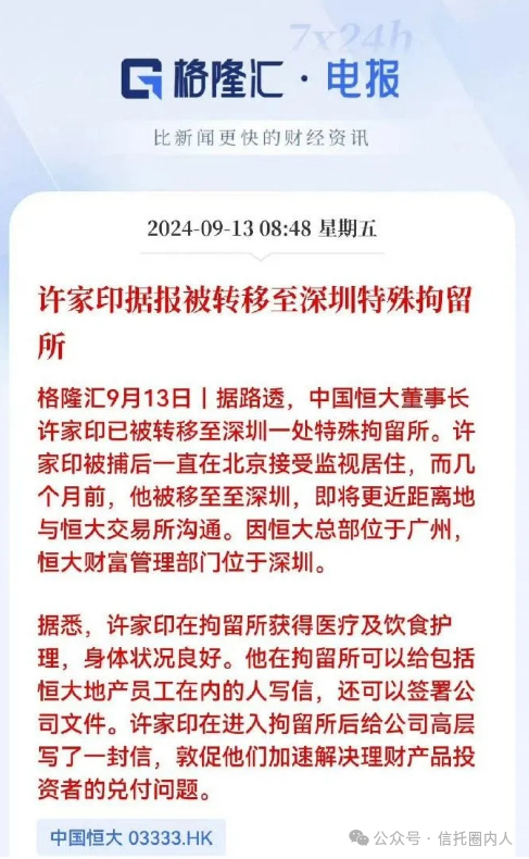 近日,信托圈内人获悉,据相关媒体披露,许家印已被转移至深圳的特别拘留所。