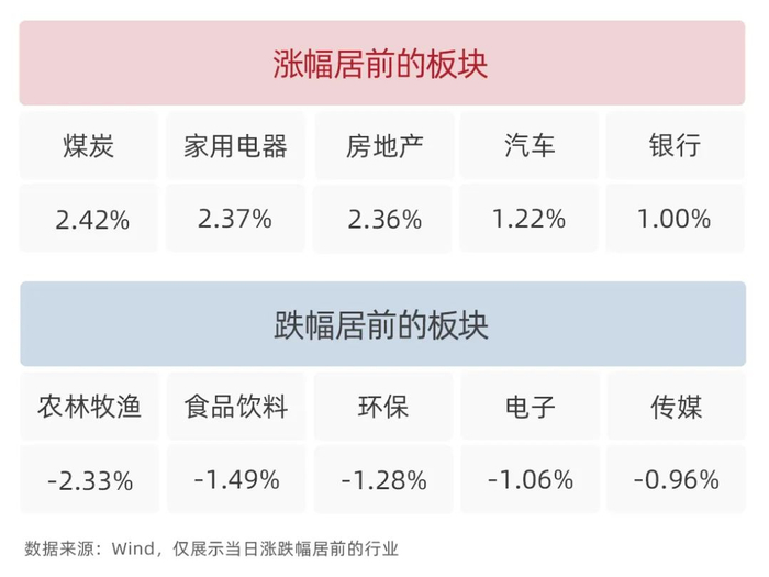 1、走强板块中,煤炭、家用电器、房地产板块领涨。Wind数据显示,煤炭行业上周进口量微幅下降,供给端呈现边际收紧,市场情绪有所改善,中秋节后第一个交易日板块迎来拉升。以旧换新政策影响提升动能,白色家电领涨带动行业板块上行。9月17日,南京市发布《发放2024年金秋房展会限时购房补助的通知》,房地产板块上行。