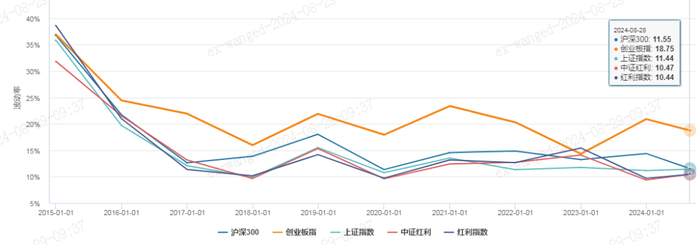 红利基金的首要特征就是高股息率。据Wind显示,截至2024年8月29日,市场上主要红利指数--上证红利指数(代码:000015)和中证红利指数(代码:000922)的股息率分别达到了5.21%和5.06%,远远高于市场上很多主流指数的股息率。