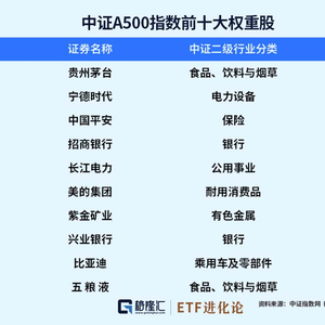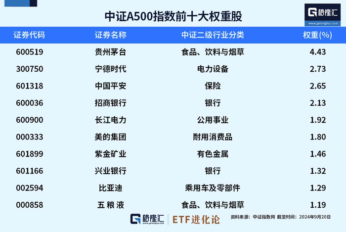 中证A500最大权重股贵州茅台,权重4.43%;其次为宁德时代、中国平安、招商银行,权重均超2%;再者,长江电力、美的集团、紫金矿业、兴业银行、比亚迪、五粮液,权重均超1%。