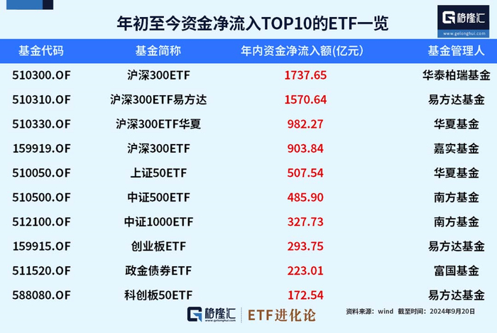 年初至今超8000亿资金净流入ETF市场。其中,4只沪深300ETF年内吸金5194亿,华夏上证50ETF资金净流入超507亿,南方中证500ETF、南方中证1000ETF资金净流入分别为485.9亿、327.7亿。