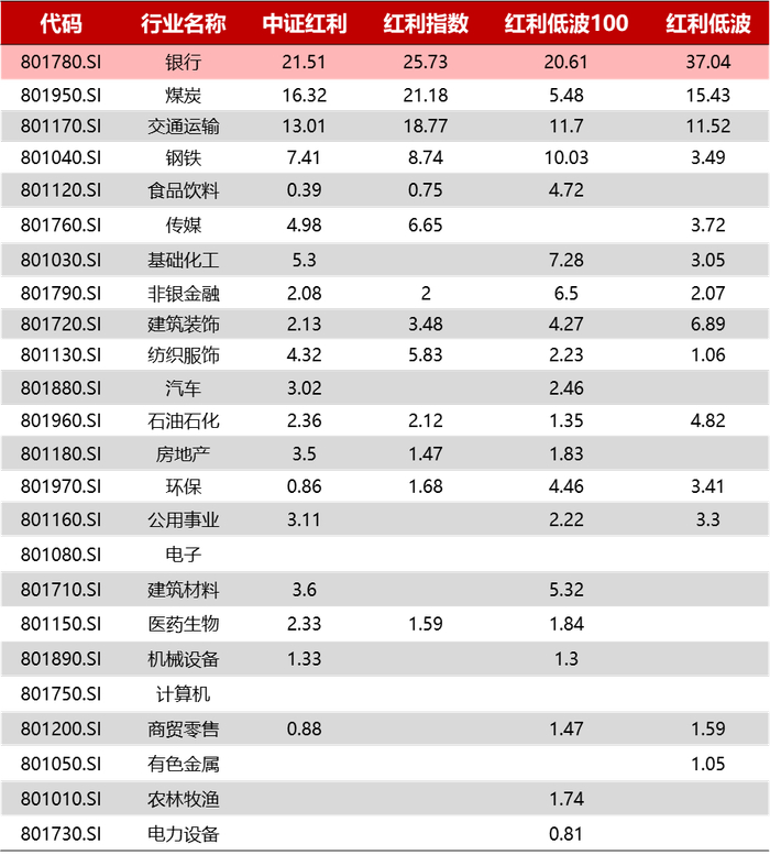 主流红利指数第一大权重行业