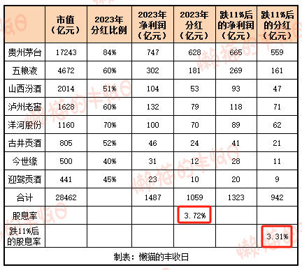 假设保持2023年分红比例不变,利润跌11%,分红变成了942亿元,股息率是3.31%。