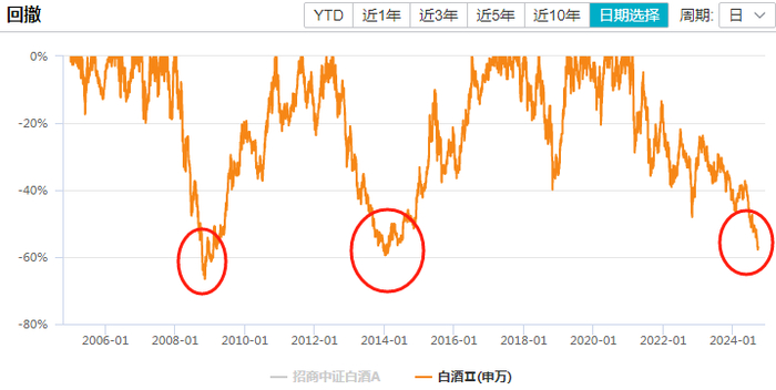 2007年12月-2008年11月,白酒指数最大回撤66.53%,回撤11个月。