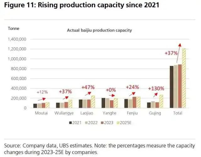 2021-2025年,茅台产能扩张了12%,五粮液产能扩张了37%,泸州老窖产能扩张了47%,山西汾酒产能扩张了24%,古井贡酒产能扩张了130%,洋河没扩张。