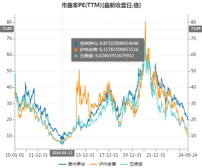 但2014年,因为悲观预期和业绩下滑,白酒指数的PE最低跌至7.85倍,茅台的PE跌至9倍,五粮液、泸州老窖的PE更是只有6倍出头。