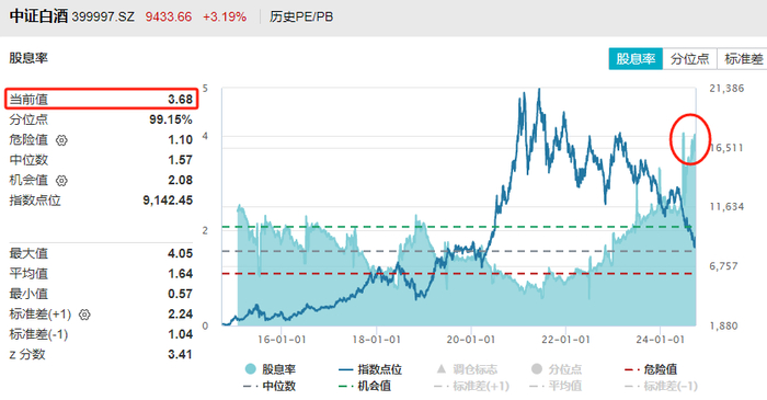 中证白酒的股息率在9月18日曾到过4.02%,昨天收盘是3.68%。