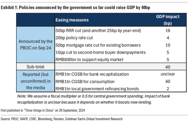 今日的发布会并未提及市场此前传说的增量财政政策。投资者可继续关注本月的人大会议是否有这方面的内容。根据高盛估算,此前人民银行公布的货币政策可给中国的GDP带来0.4%的增长;一些市场上流传(但未经证实)的财政政策可能带来与之相当的增长。高盛在最新的报告中将沪深300的目标价上调至4,600点(今收4,256.10点)。