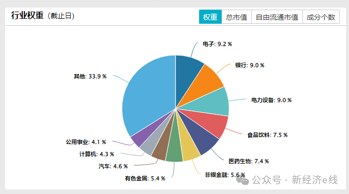 Wind统计表明,截至2024年10月15日,中证A500指数前五大行业分别为工业、金融、信息技术、原材料、可选消费,前五大行业权重占比69.7%;代表新质生产力的工业、信息技术、通信服务、医药卫生权重占比合计48.7%,占比高于可比宽基指数。