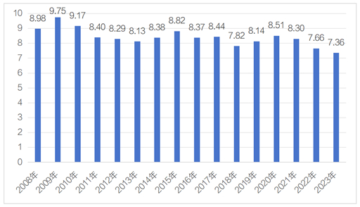 2008-2023年社保基金年均投资投资收益率(单位:%)