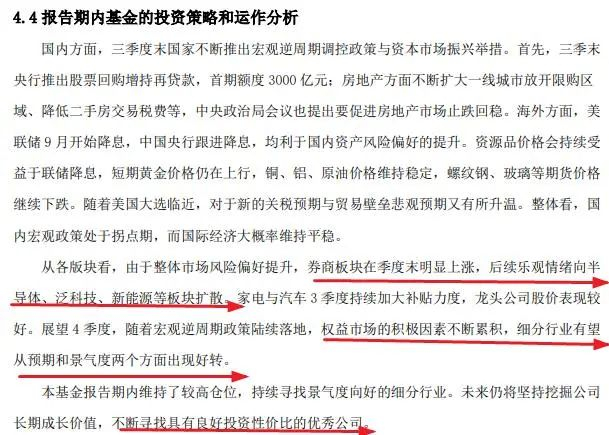 谢治宇在三季报里面也发表了比较积极的观点,他表示随着宏观逆周期政策陆续落地,权益市场的积极因素不断累积,细分行业有望从预期和景气度两个方面出现好转。