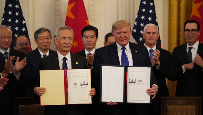 ▲2020年1月15日,时任美国总统特朗普与中方代表共同出席中美第一阶段经贸协议签署仪式。