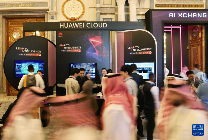 ▲9月10日,人们在沙特阿拉伯首都利雅得举行的第三届全球人工智能峰会现场的华为云展台参观。