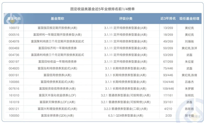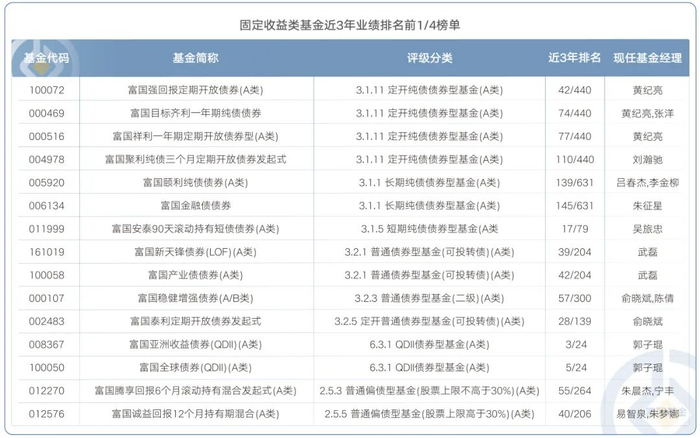 银河证券基金研究中心数据显示,富国基金固定收益型基金近5年业绩排名进入同类前1/4分位的共14只,近3年进入前1/4的共15只,近1年进入前1/4的共21只。