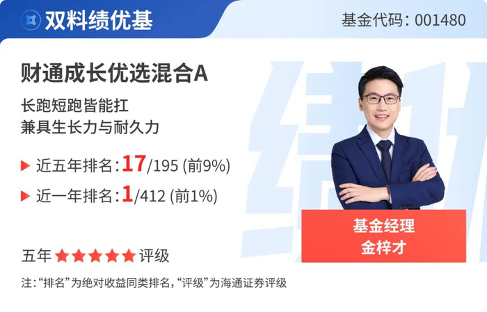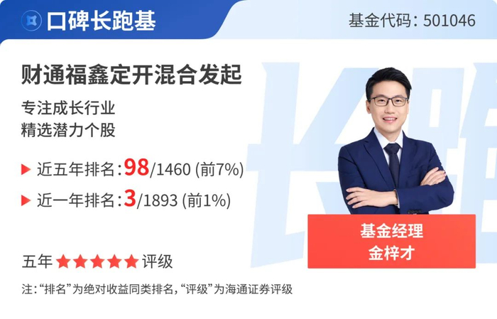 5只基金近一年排名位列同类前1%:财通智慧成长混合、财通匠心优选一年持有期混合、财通景气甄选一年持有期混合、财通成长优选混合、财通福鑫定开混合发起。