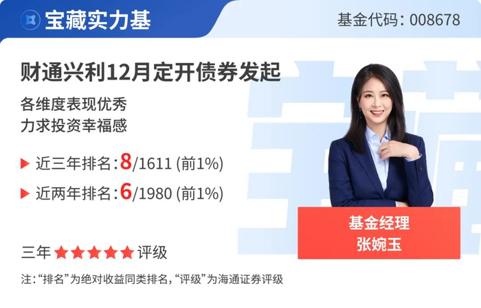 财通兴利12月定开债券发起近三年(2022.01.01-2024.12.31)业绩排名位列同类(纯债债券型)8/1611,近两年(2023.01.01-2024.12.31)业绩排名位列同类(纯债债券型)6/1980,近一年(2024.01.01-2024.12.31)业绩排名位列同类(纯债债券型)158/2386。