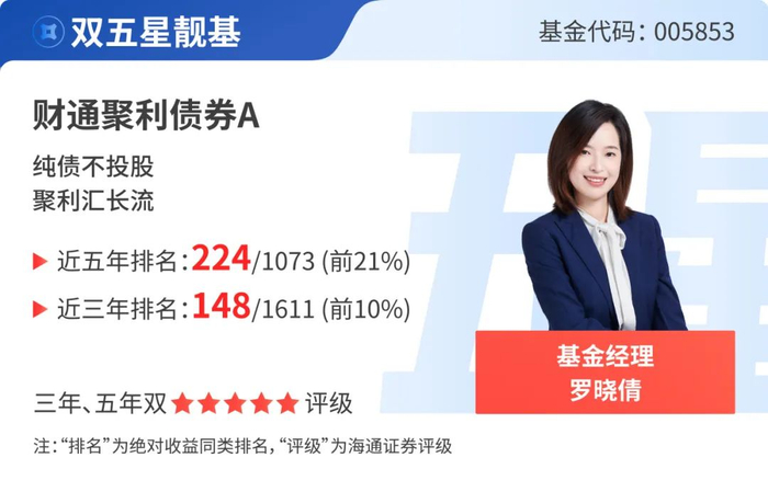 财通聚利债券近五年(2020.01.01-2024.12.31)业绩排名位列同类(纯债债券型)224/1073,近三年(2022.01.01-2024.12.31)业绩排名位列同类(纯债债券型)148/1611,近两年(2023.01.01-2024.12.31)业绩排名位列同类(纯债债券型)414/1980,近一年(2024.01.01-2024.12.31)业绩排名位列同类(纯债债券型)1706/2386。