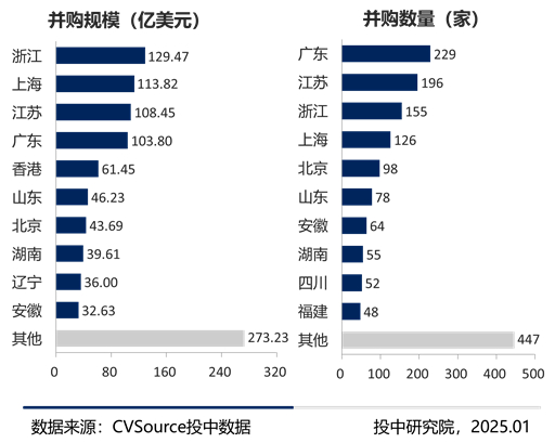 2024年,医疗健康交易规模独占鳌头,浙江、上海、江苏交易规模居于前三。