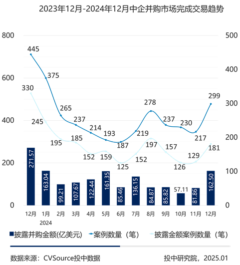 2024年12月,共计完成299笔并购交易,环比上涨37.79% ,同比下降32.81%;当中披露金额的有181笔,交易总金额为162.50亿美元,环比上涨98.51%,同比下降40.16%。交易规模达到近半年最高值。