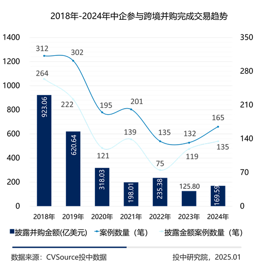 2024年共计完成165笔跨境交易,同比上涨25.00%;当中披露金额的有135笔,交易总金额为169.59亿美元,同比上涨34.81%。