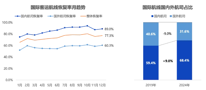 分航司看,2024年国内航司航班的国际班次恢复至89%,国外航司仅恢复至60.3%。近年,外国航司对国内航线的收缩较大,保留中国航线的航司也缩减了一些运力,如使用787替换380。