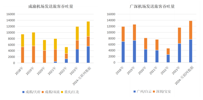 与上一轮各地批量上马机场并依靠政府补贴开设航线增加客流不同,本轮民航复苏可能更依赖枢纽机场客流量的增长,以旅客吞吐量口径计算(2018-2023年数据为民航总局,2024年数据为互联网数据,下同),相较2019年,前40大机场合计多吞吐旅客9632万人次,其中成渝三座机场(成都天府、成都双流、重庆江北)贡献了3563万人次,贡献率为37%;北京、上海、深广、成渝9座机场贡献了相对2019年旅客吞吐增量的61.5%。