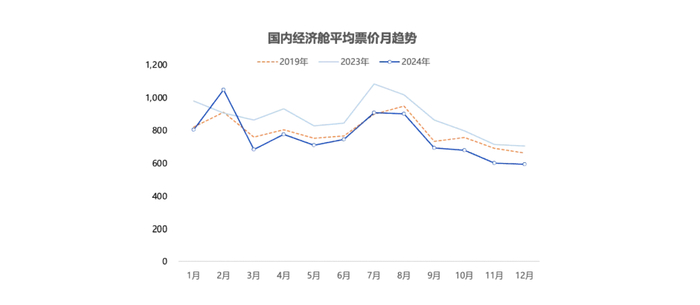 由于本轮复苏以枢纽航点推动,枢纽机场航线竞争相对激烈,2024年民航经济舱平均票价约767元,同比下降12.1%,同比2019年下降3.8%。
