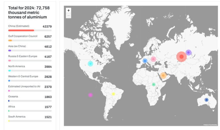 ▲2024年度世界前十大原铝生产国,中国位列第一。图源国际铝业协会(International Aluminium Institute)