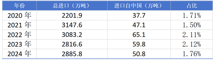 ▲2020至2024年度美国钢铁进口量、来自中国的进口量及其占比。数据源于美国钢铁协会(American Iron and Steel Institute)