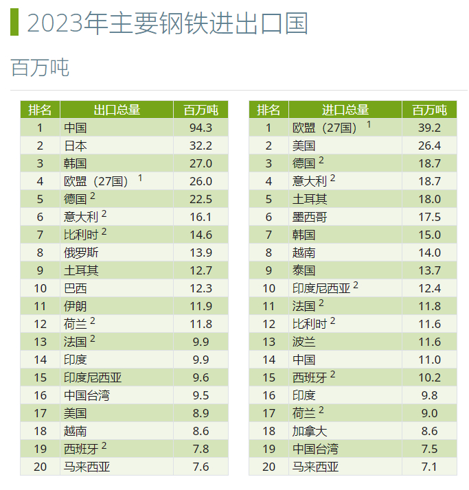 在全球的钢铁和铝行业,中国的钢、铝产量相当于全球其他国家的总和,甚至更多。2024年,中国累计出口钢材11071.6万吨,同比增长22.7%。根据“国际钢铁协会”(Worldsteel)2023年度发布的报告,中国在当年主要钢铁出口国中排名第一,其钢铁出口总量比第二、三、四名的日本、韩国和欧盟加起来还要多。在2023年度排名前十的主要钢铁生产公司(粗钢产量)中,中国企业占了6家,排名第一的宝武钢铁集团的产量达1亿3077万吨。而2023年和2022年,中国也稳居主要钢铁生产国(粗钢产量)首位,产量大幅领先于其他国家。